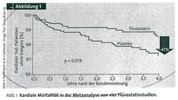 Stammt aus Cardiovasc Drugs Ther (2004);18:67. Da wurden vier Studien zusammengefasst. 3525 Patienten mit koronarer Herzkrankheit. Alle bekamen das Statin Fluvastatin und gemessen wurde nach 4 Jahren, ob dieses Statin eine segensreiche Wirkung gehabt hatte.