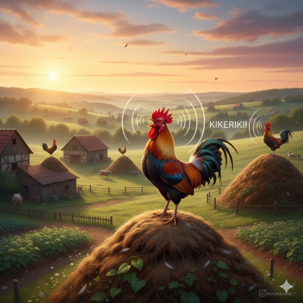 Und jeden Tag das gleiche: Ein stolzer Hahn stellte sich ganz oben hin und fing an zu… kikerikien. Lauthals. Sofort erklomm der Nachbarhahn den Nachbarmisthaufen und antwortete. Noch lauter.