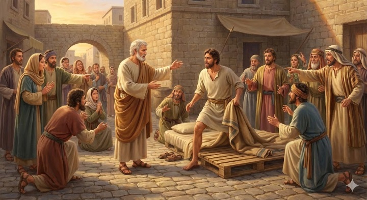 Petrus und der geheilte Äneas - Bild mit Gemini generiert