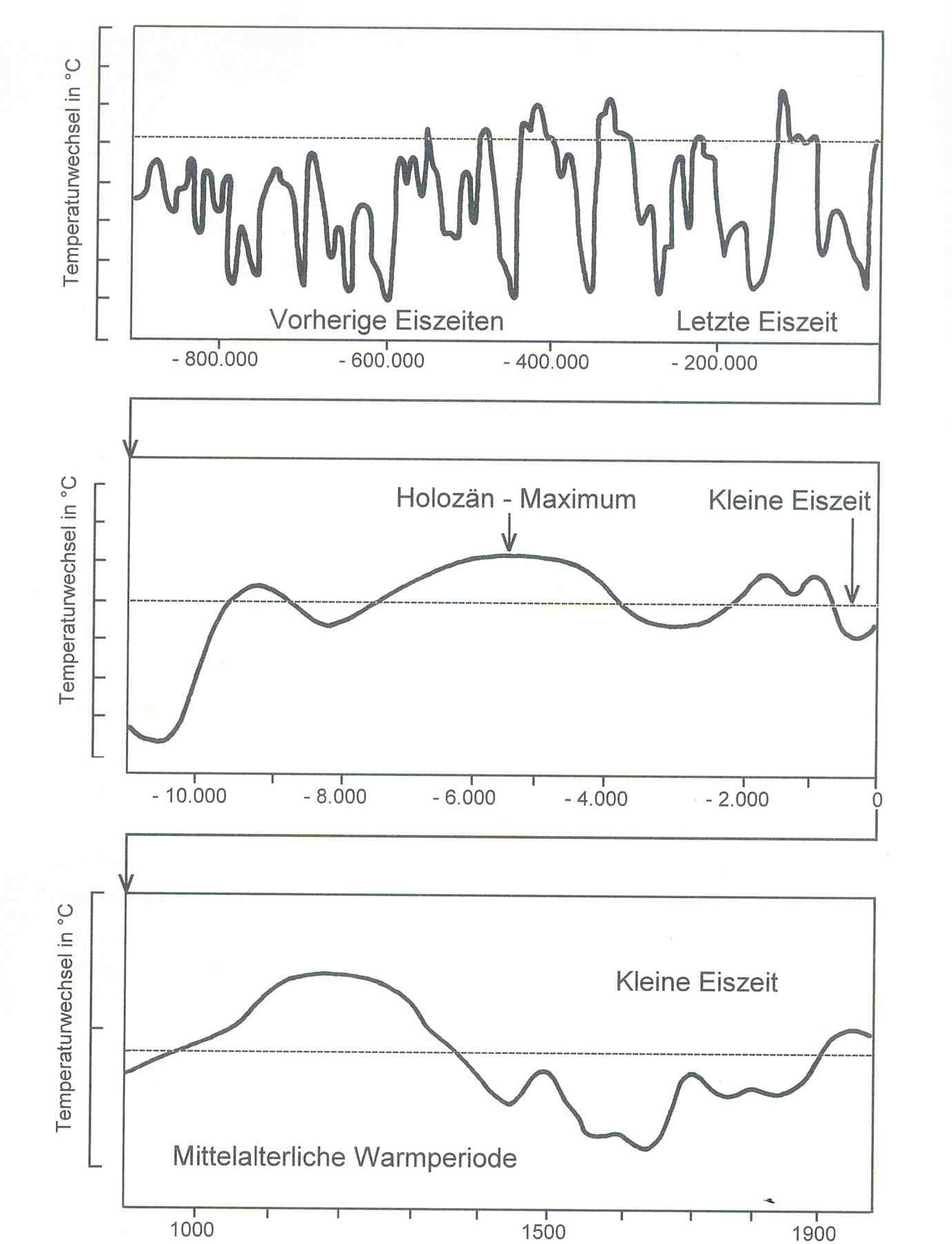 Das mittlere Diagramm zeigt Temperaturschwankungen während der letzten 10 000 Jahre. Das klimatische "Optimum" (kurz nachdenken) lag demnach vor etwa 5 bis 6000 Jahren.