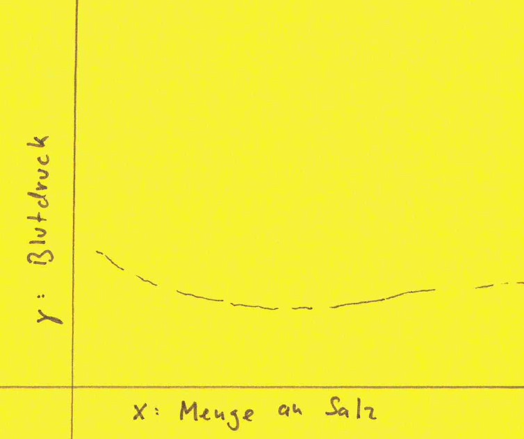 Die Antwort auch hier ist: "U-shaped relationship". Die Kurve, die den Wirkungszusammenhang zwischen Blutdruck und Menge an Salz beschreibt, ist ein flaches U.